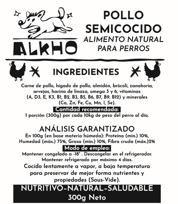Carne de pollo, zanahoria, hígado de pollo, almidón natural, brócoli, zanahoria, arvejas, linaza molida (fuente natural de omega 3 y 6), vitaminas (A, D3, E, K3, B1, B2, B3, B5, B6, B7, B9, B12) y minerales (Calcio, Zinc, Fierro, Cobre, Manganeso, Yodo, Selenio).